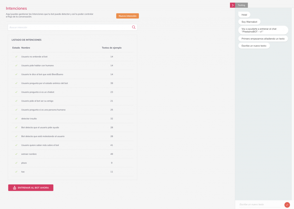 Una vez hayamos creado las diferentes intenciones, debemos pinchar “Entrenar al bot ahora” para que comience el entrenamiento. Tranquilo, solo tardará unos segundos.